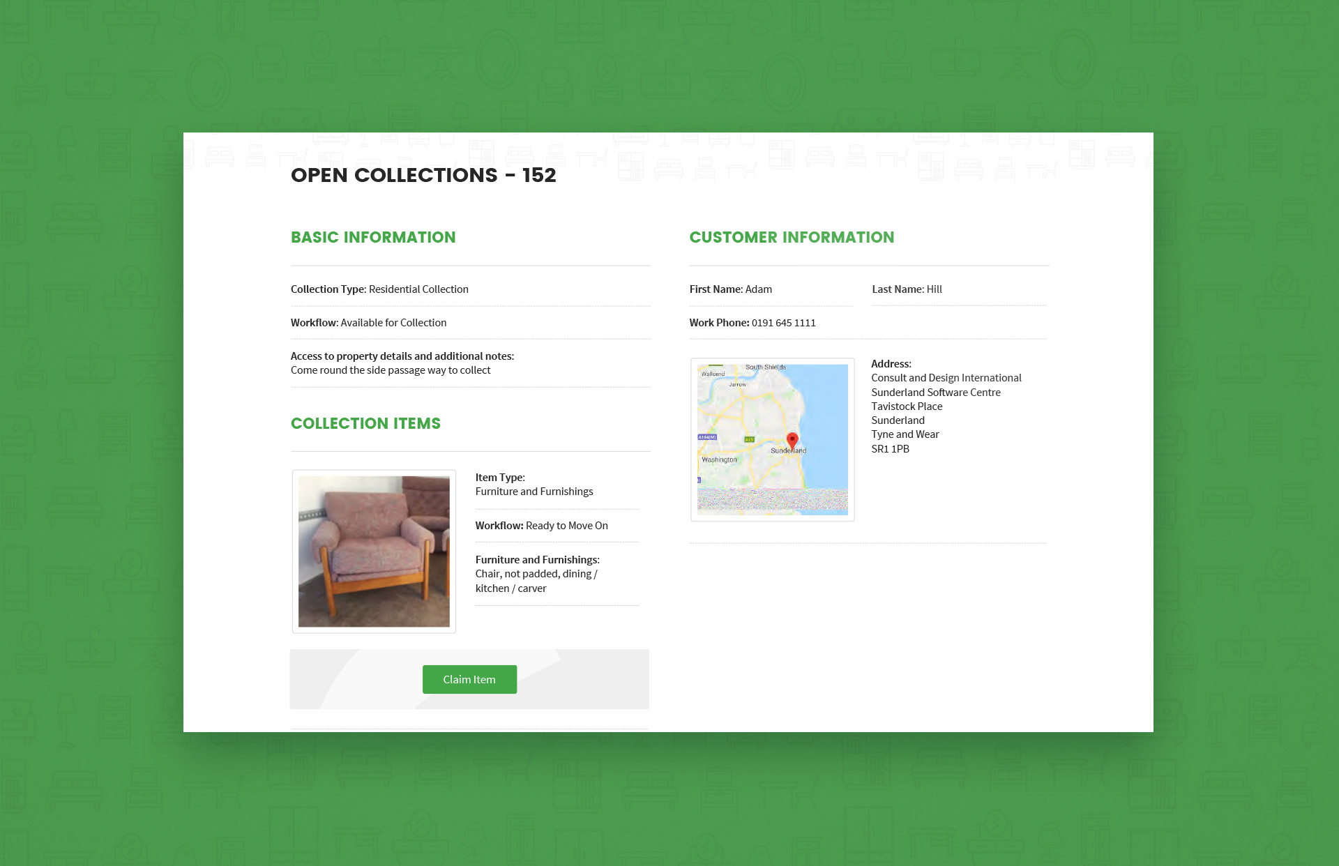 The system can be used to manage items from the point of picking up a donation, through refurbishment and warehousing, purchase on-site and delivery to a customer.