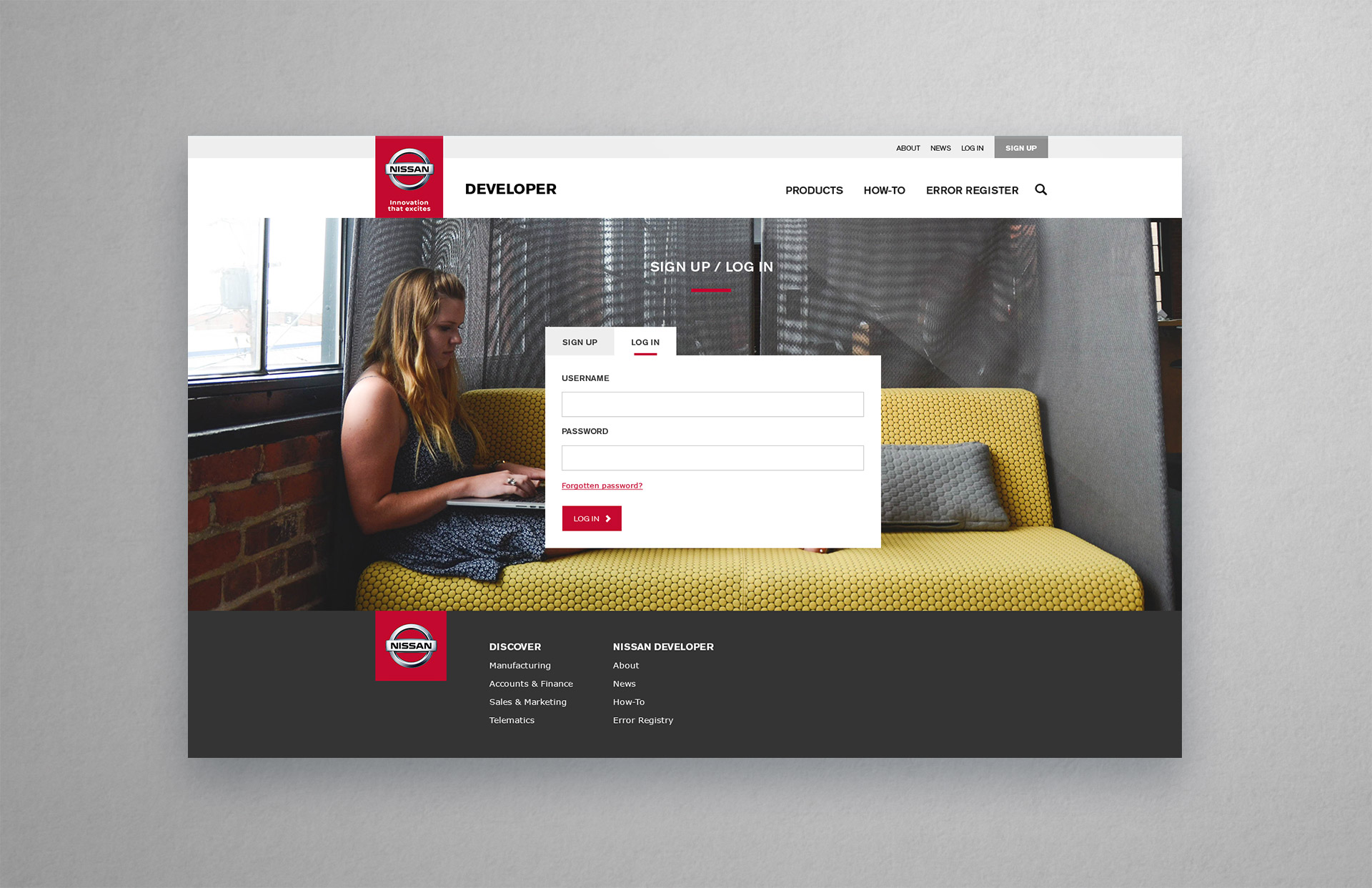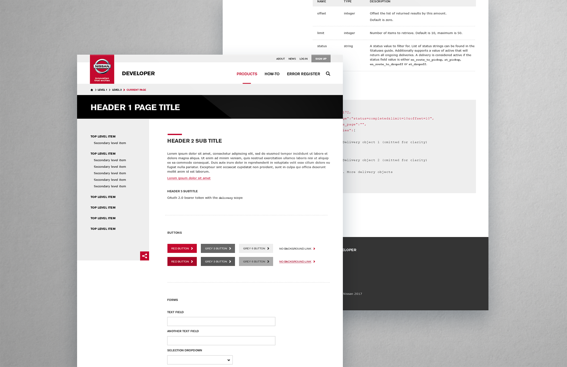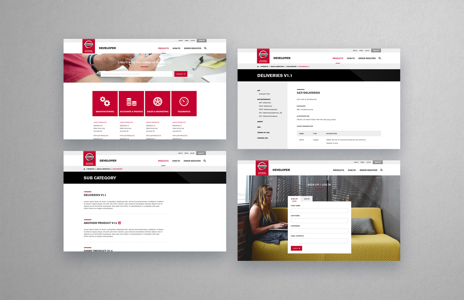 Design is simple but adheres to the Nissan Global Brand Guidelines. Imagery and icons on featured pages adds a feel setting the developer portal aside from other Nissan websites.