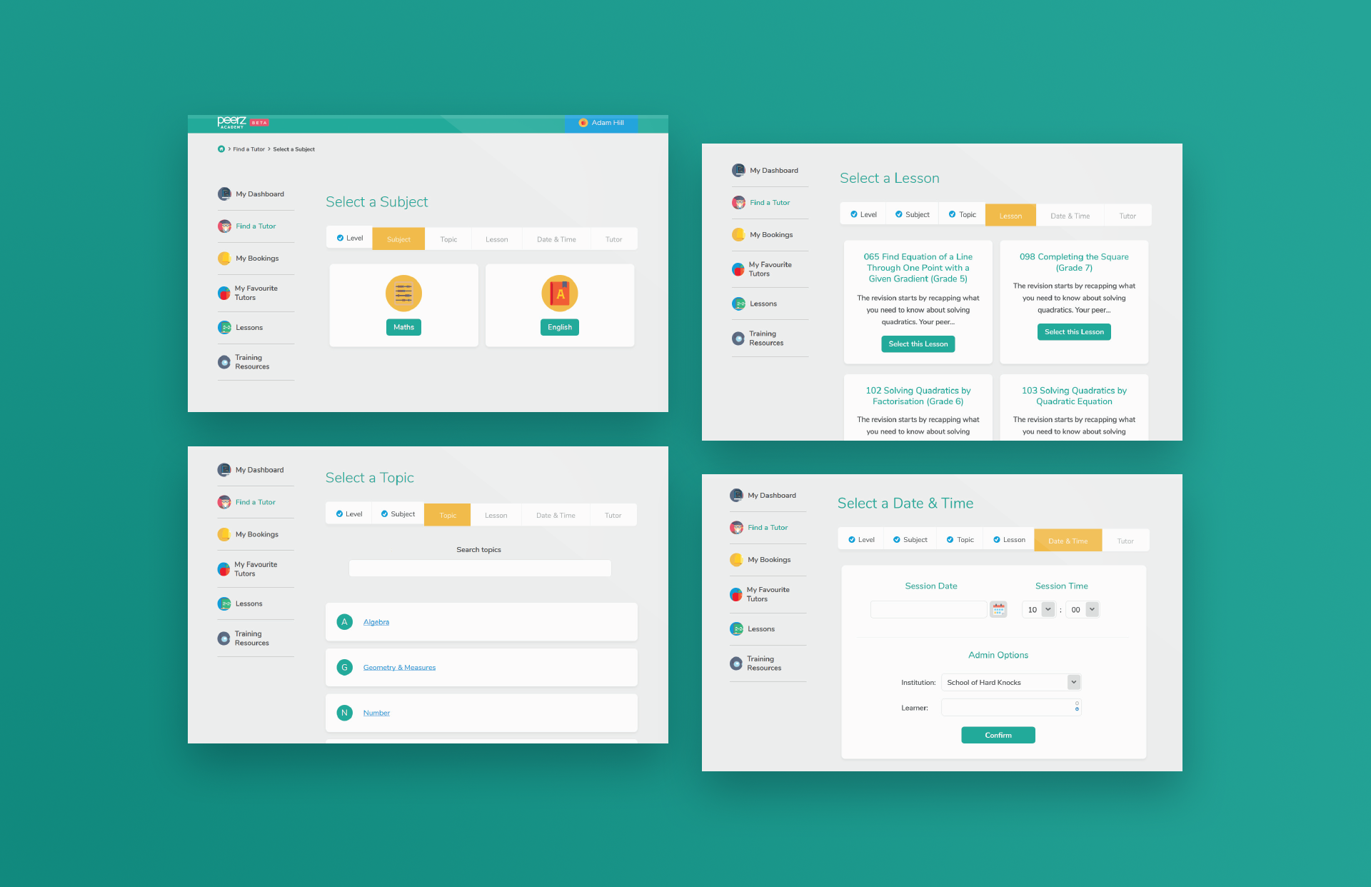 The design of the system is centred around breaking down processes, such as verifying learners and booking sessions, into a series of steps with progress displayed clearly.