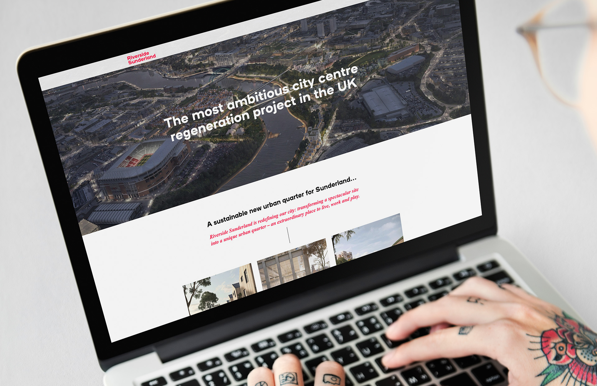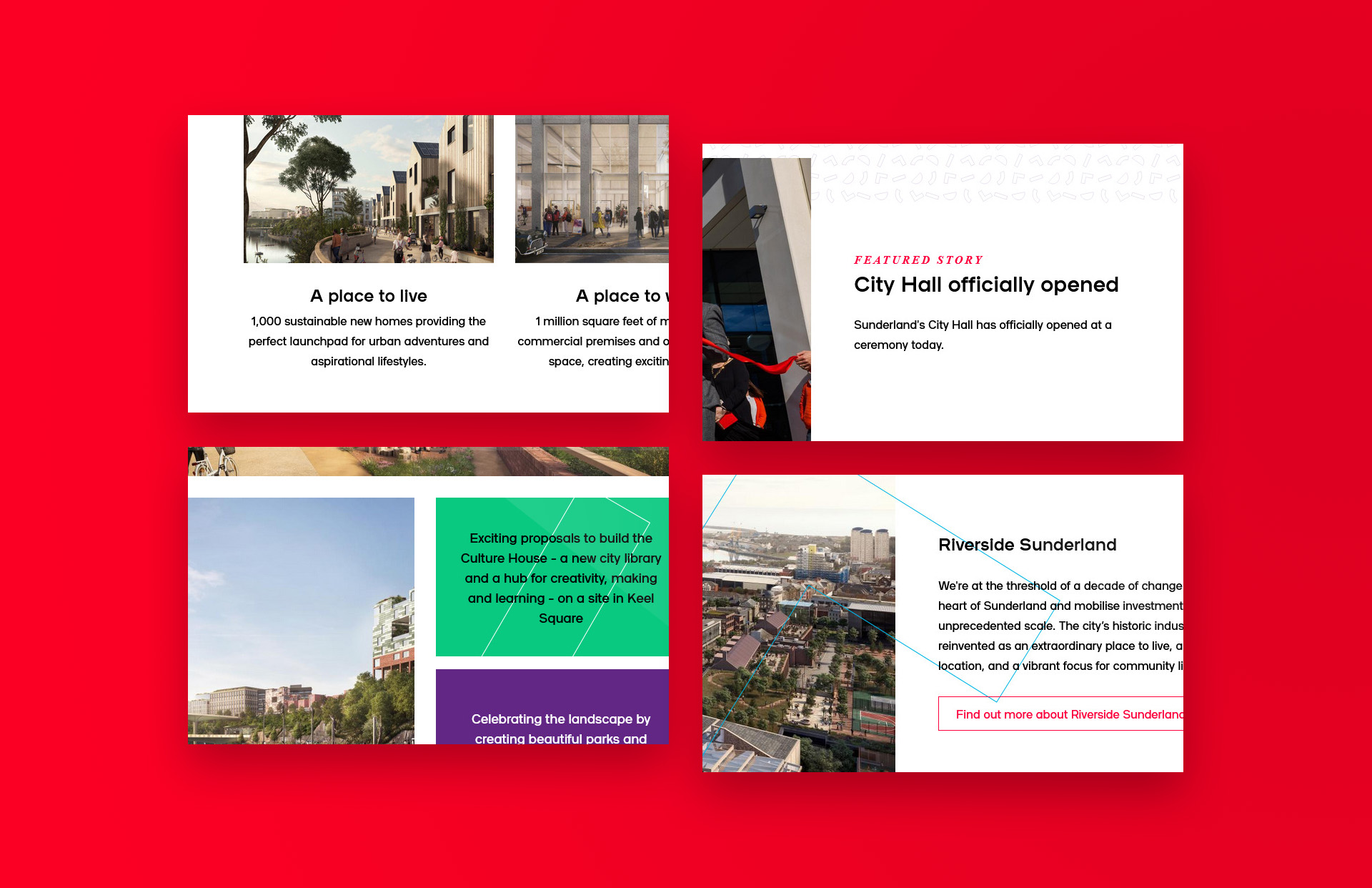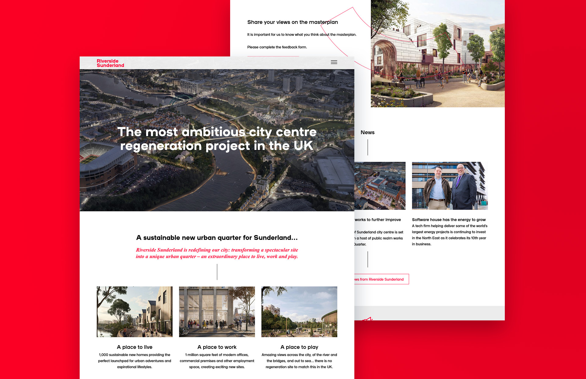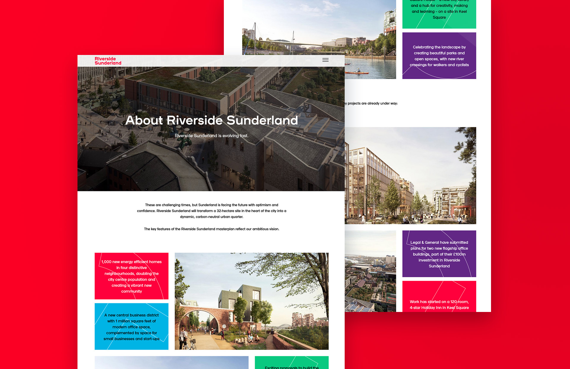 Design of this brochure website stripped back the distinctive bold Riverside Sunderland branding, pairing with aspirational images of Sunderland's future to appeal to residents, businesses and investors.